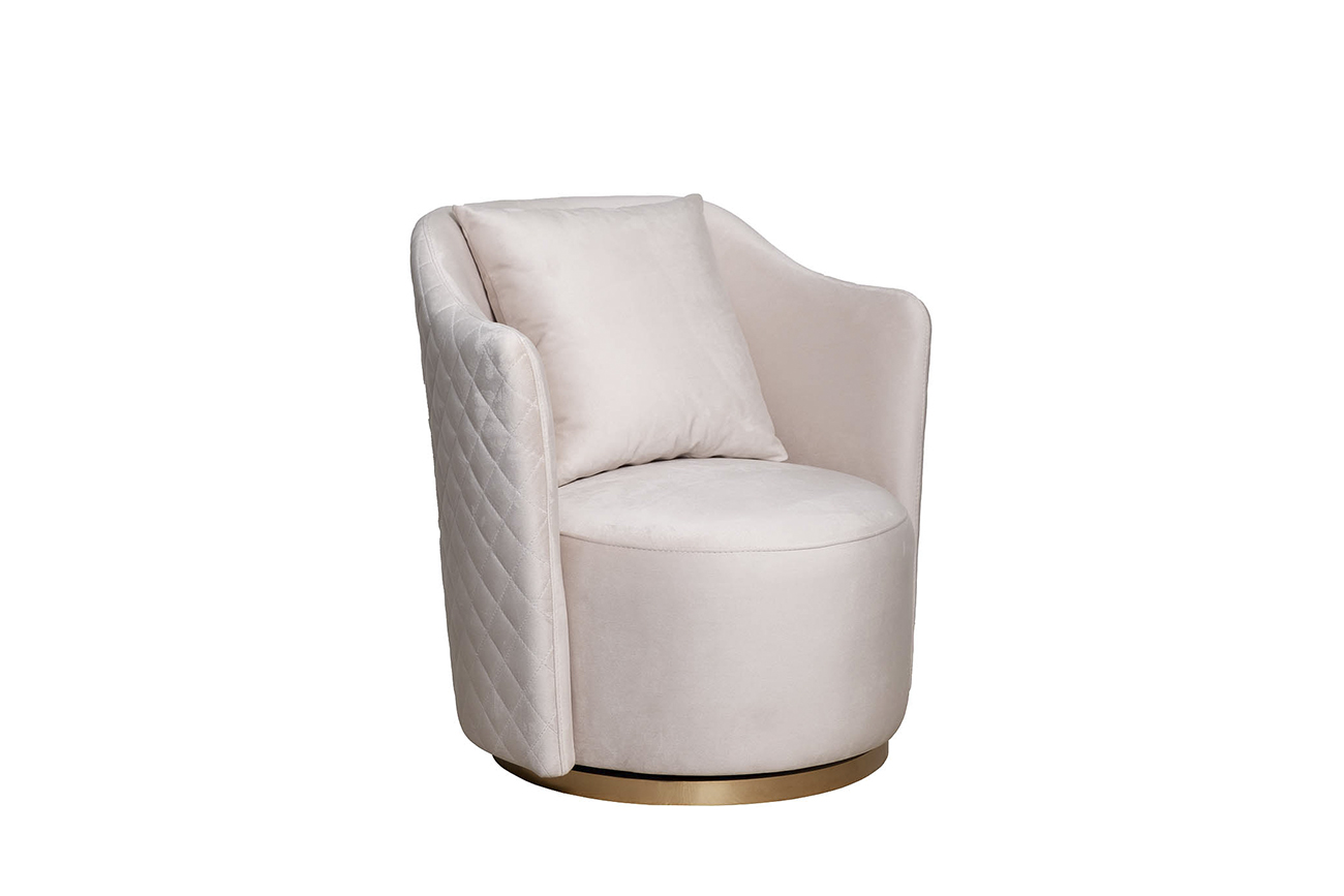 Особенности этой модели – металлическое основание с глянцевым золотым покрытием и простеганная снаружи спинка, которая вносит в дизайн кресла нотку аристократизма. Мягкое сиденье и подушка делают его особенно уютным. Предлагаем купить кресло для дома в различных вариантах ткани. Собственное производство позволяет нам реализовывать индивидуальные заказы клиентов. Наполнитель пенополиуретан. Размер сиденья Г58*Ш60*В40см. Диаметр металлической части основания - 58см, высота - 3,5см. В стандартном исполнении: обивка - ткань велюр из коллекции тканей Garda Decor Colton002, основание - полированная нержавеющая сталь с глянцевым золотым гальваническим покрытием.
